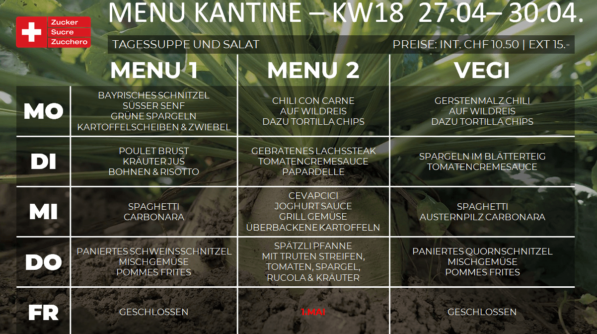 Menüplan Kantine Zuckerfabrik KW18